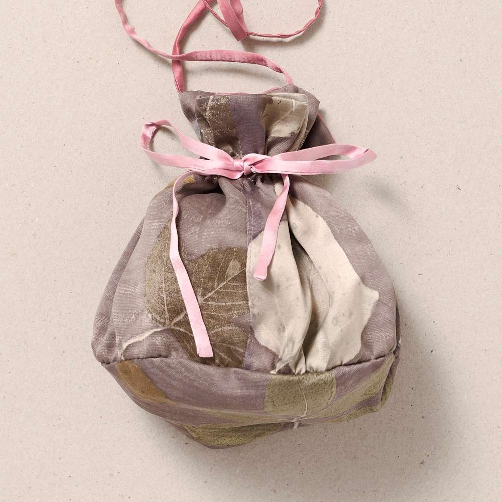 Eco-printed grey on one side, with a pink reversal. Lightweight, it moves between casual and elevated wear. It can be carried wrapped around the wrist or worn over the shoulder, thanks to the fine silk strap. The reverse side remains unseen, a detail meant to be discoved in person. The reveal is part of the story. Each piece comes with a signed certificate of authenticity listing the natural dyes, techniques and materials used in its making. Uncover what’s within yours.