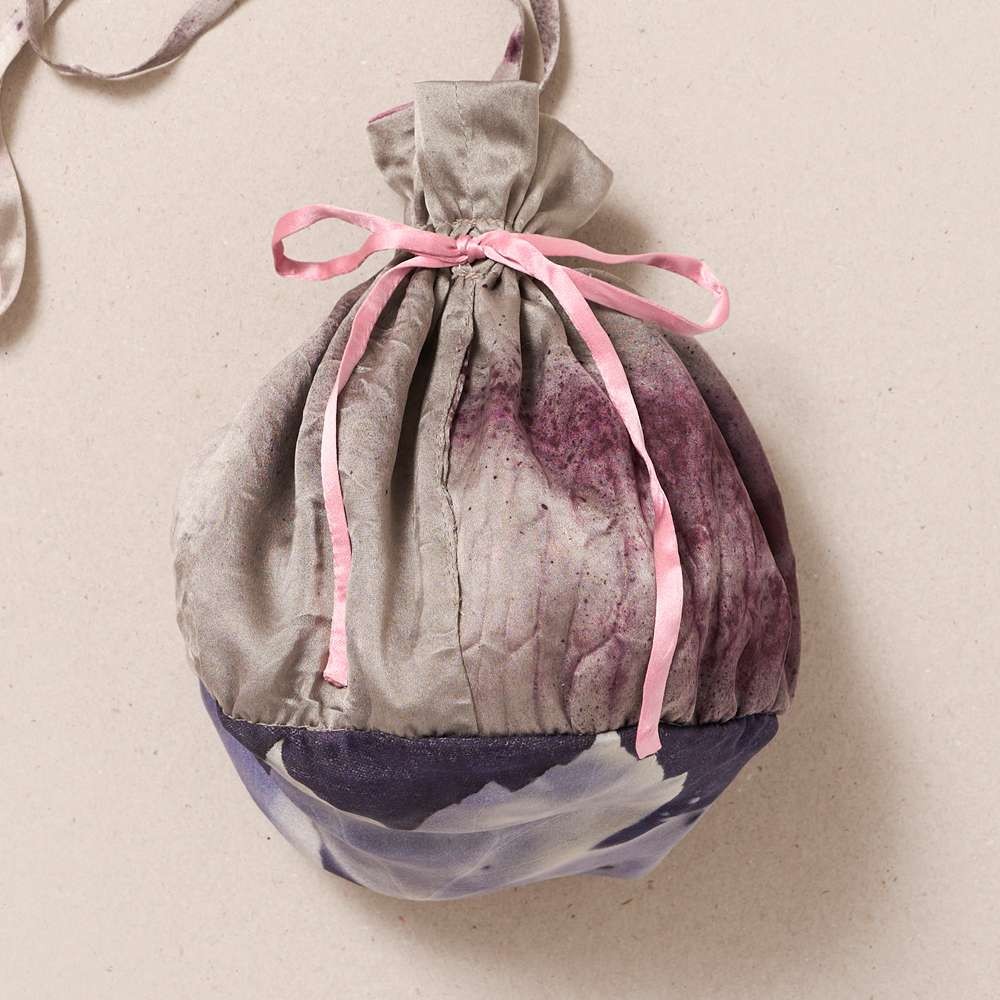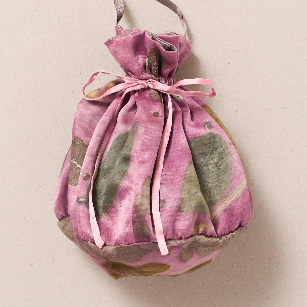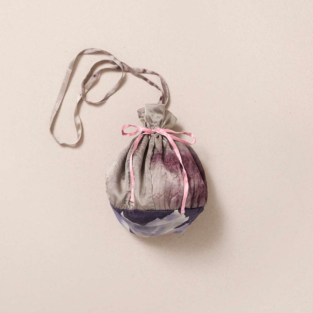 Eco-printing in soft pink unfolds on one side, while the reverse is naturally dyed in muted grey, grounded by a dinstictive blue base. Lightweight, it adapts with ease to both casual and dressed-up momemts. It can be carried wrapped around the wrist or worn over the shoulder, thanks to the fine silk strap. Each piece comes with a signed certificate of authenticity listing the natural dyes, techniques and materials used in its making. Uncover what’s within yours.