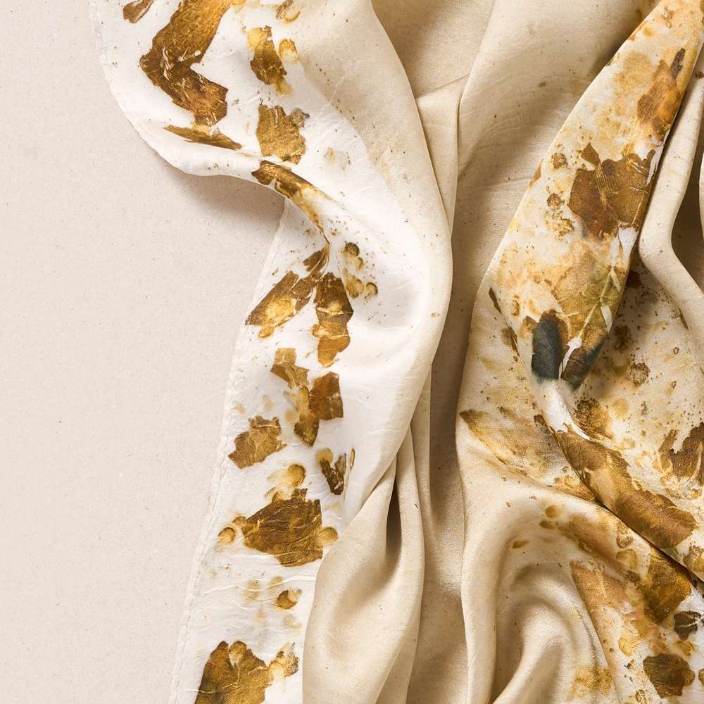 Dyed with kitchen waste, the scarf shows rich golden imprints, like clusters of stars in the night sky. Three parallel lines leave golden patterns on a pale yellow-green center, while the edges retain a white background. Square silk scarf versatile to wear around the neck, over the shoulders or styled in the hair, a modern nod to the elegance of traditional greek women who draped scarves gracefully on their heads. Each 100% silk piece comes with a signed certificate of authenticity listing the natural dyes, techniques and materials used in its making. Uncover what’s within yours.