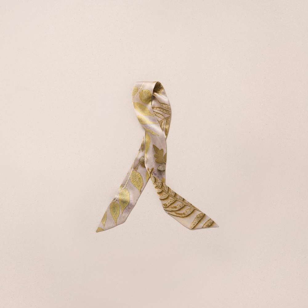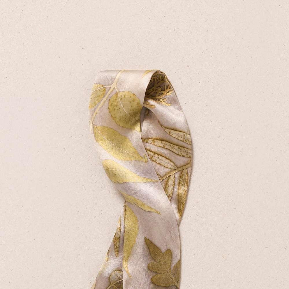 Eco-printed leaves leave their gold imprints on an off-white silver background. Consider it your most adaptable silk accessory. Add a twist to your outfit -neck, hair, headband, wrist or arm, bag strap- endlessly wearable and open to your own interpretation. The "Silkline" series celebrates the essence of Greece, honoring its folk traditions, festivals, arts and cultural heritage that shape the soul of the country. Each 100% silk piece comes with a signed certificate of authenticity listing the natural dyes, techniques and materials used in its making. Uncover what’s within yours.