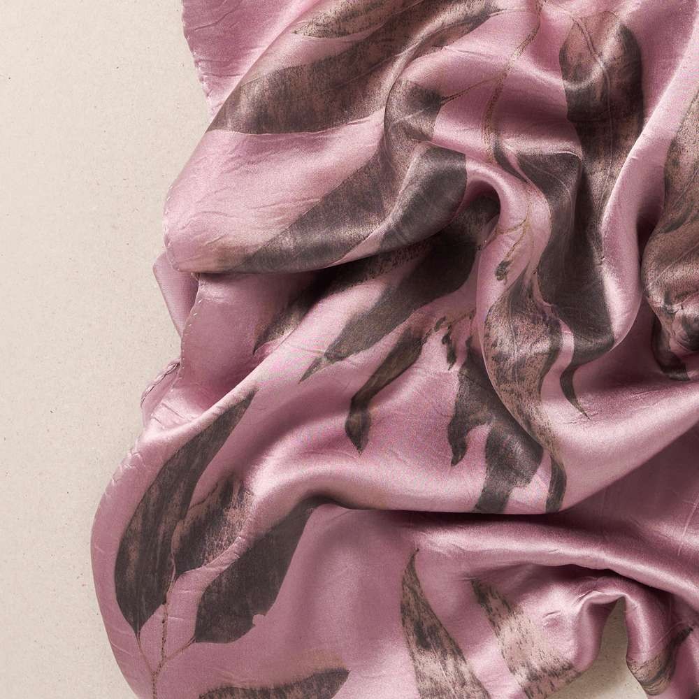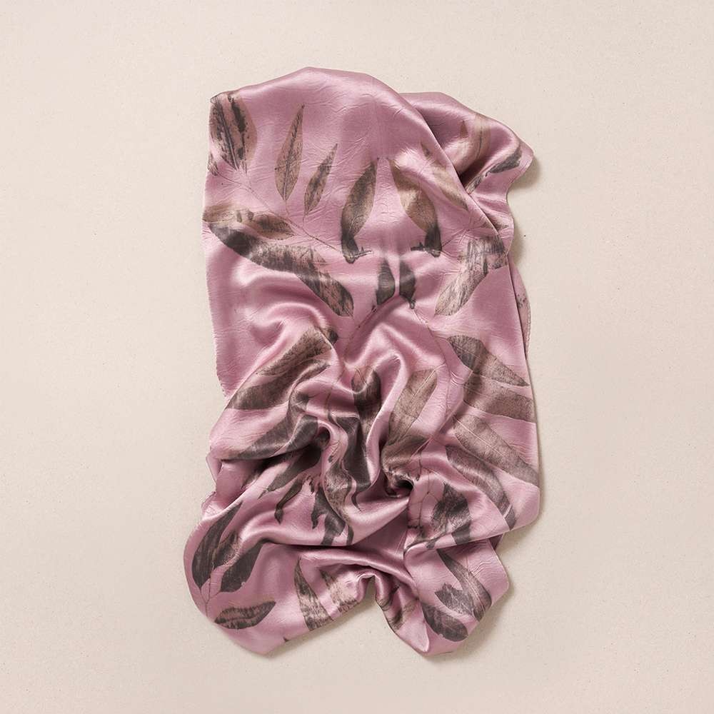 A violet eco-printed scarf with deep leaf marks. Whether worn loosly over the shoulders, tied at the neck or wrapped as a headpiece, it completes your look. Drape it. Wrap it. Knot it. Each 100% silk piece comes with a signed certificate of authenticity listing the natural dyes, techniques and materials used in its making. Uncover what’s within yours.