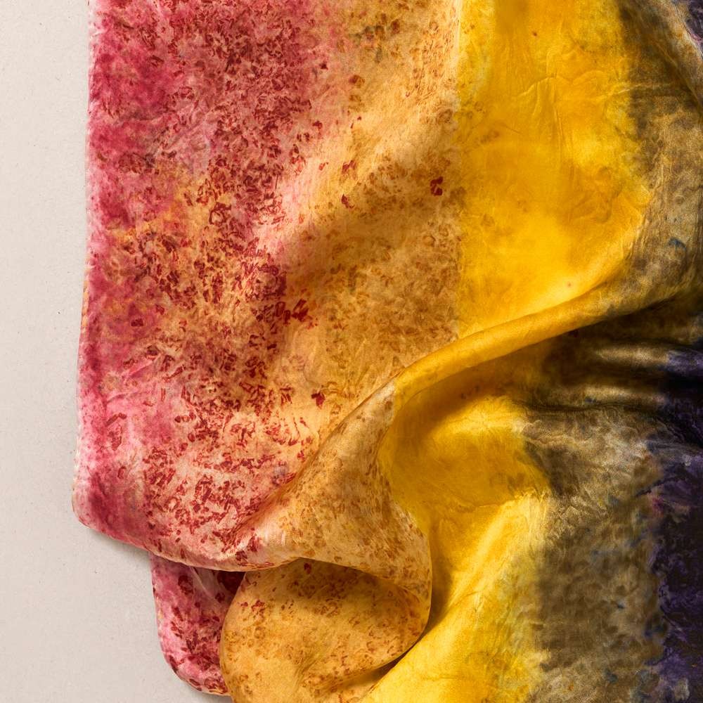 Hand-dyed in shades inspired by the Pride flag. However you style it, it reflects strenght and freedom of mind, for all who wear it. Each 100% silk piece comes with a signed certificate of authenticity listing the natural dyes, techniques and materials used in its making. Uncover what’s within yours.