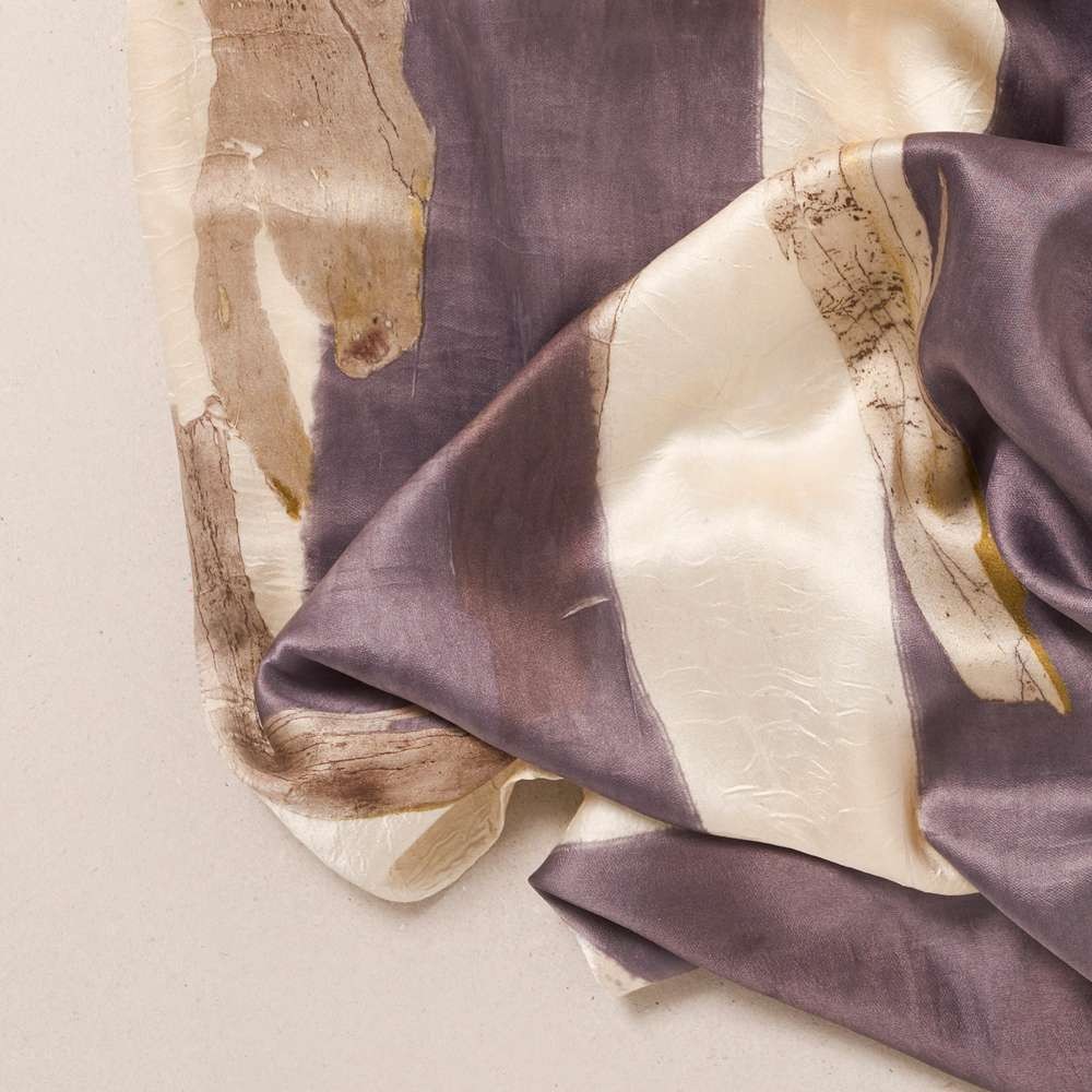 Crafted in off-white silk with eco-printed leaves and tree bark patterns. Two deep purple lines trace the length of this scarf. Whether worn loosly over the shoulders, tied at the neck or wrapped as a headpiece, it becomes part of your presence. Drape it. Wrap it. Knot it. Each 100% silk piece comes with a signed certificate of authenticity listing the natural dyes, techniques and materials used in its making. Uncover what’s within yours.