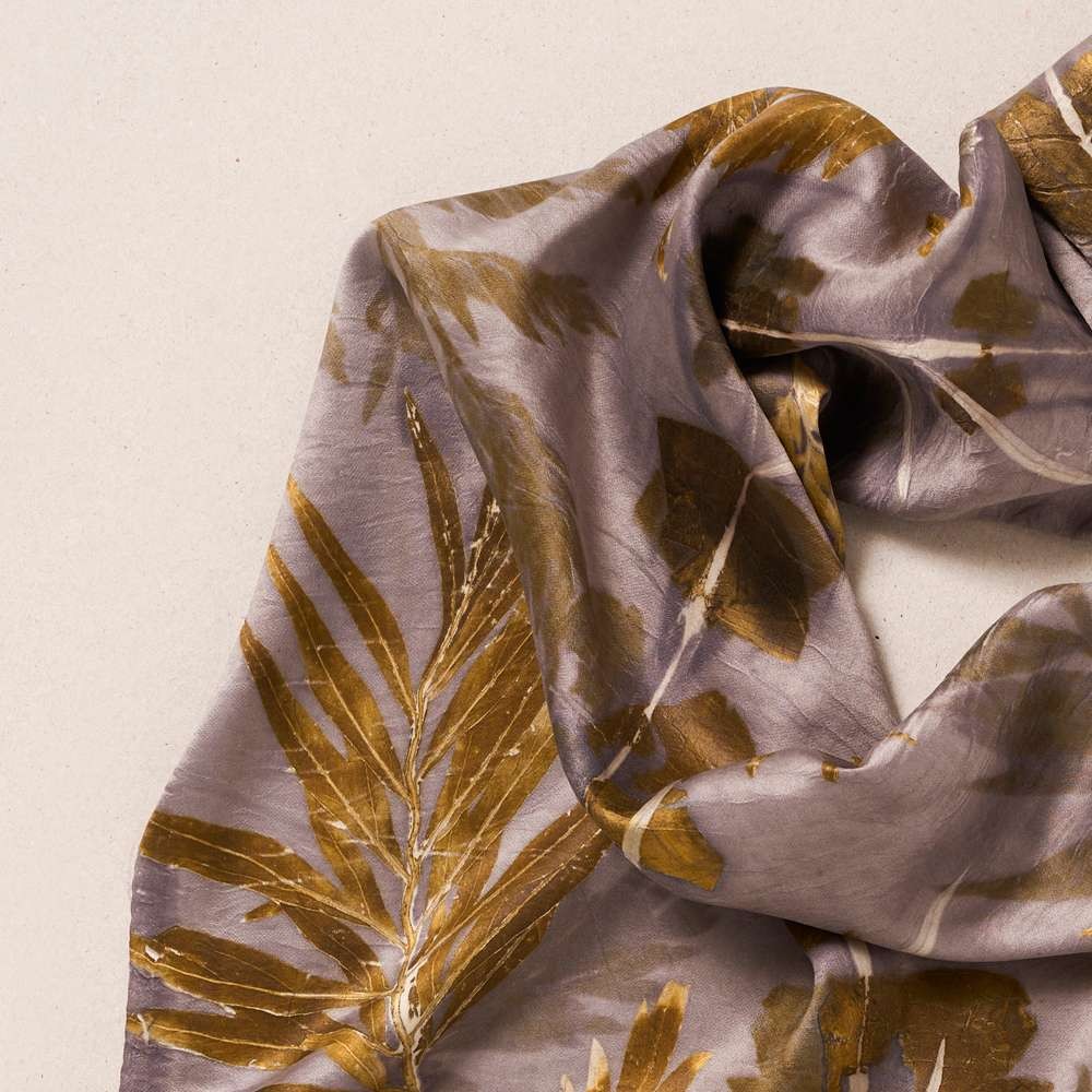 Soft grey-blue background with golden leaves eco-printed onto silk. Whether worn loosly over the shoulders, tied at the neck or wrapped as a headpiece, it adapts to the moment. Drape it. Wrap it. Knot it. Each 100% silk piece comes with a signed certificate of authenticity listing the natural dyes, techniques and materials used in its making.
