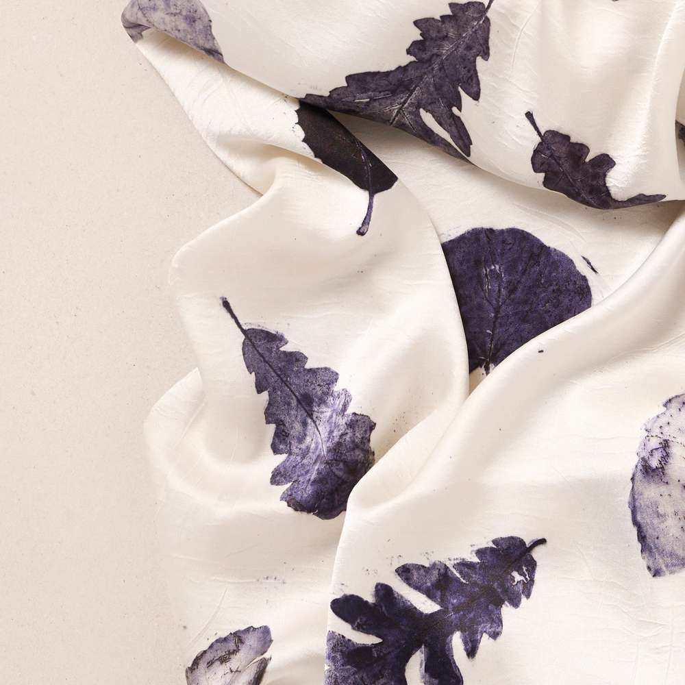 A unique eco-printing technique, where leaves are fully imptinted in shades of blue onto a white background. Whether worn loosly over the shoulders, tied at the neck or wrapped as a headpiece, it adapts to the moment. Drape it. Wrap it. Knot it. Each 100% silk piece comes with a signed certificate of authenticity listing the natural dyes, techniques and materials used in its making. Uncover what’s within yours.