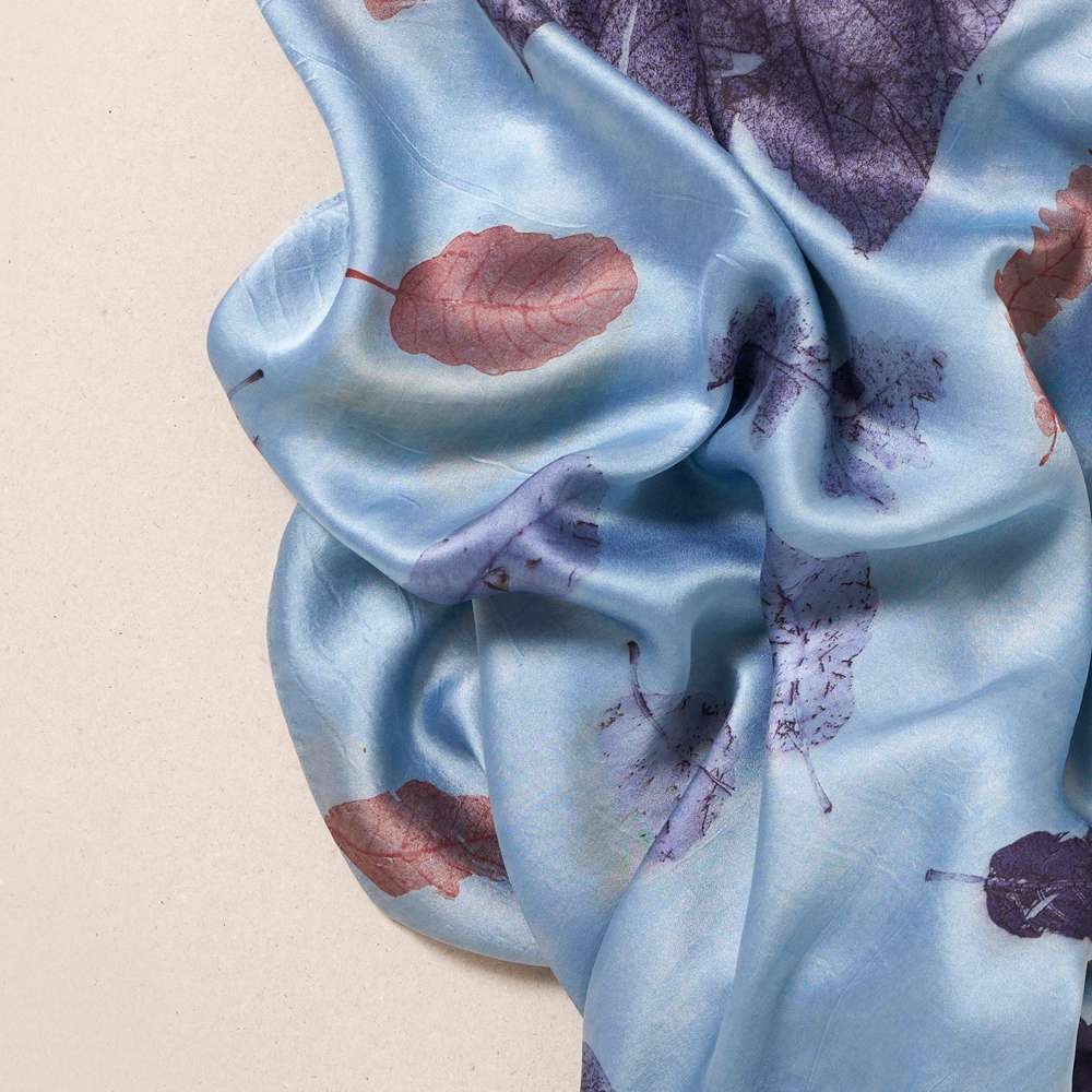 Sky-blue background, eco-printed with leaves, that through a special technique, have turned red and blue. Whether worn loosly over the shoulders, tied at the neck or wrapped as a headpiece, it adapts to the moment. Drape it. Wrap it. Knot it. Each 100% silk piece comes with a signed certificate of authenticity listing the natural dyes, techniques and materials used in its making. Uncover what’s within yours.