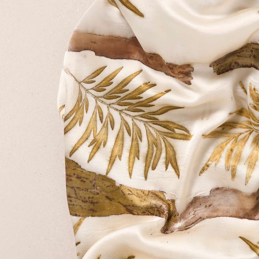 Eco-printed with a single type of leaf and tree bark on beige background. Whether worn loosly over the shoulders, tied at the neck or wrapped as a headpiece, it adapts to the moment. Drape it. Wrap it. Knot it. Each 100% silk piece comes with a signed certificate of authenticity listing the natural dyes, techniques and materials used in its making. Uncover what’s within yours.