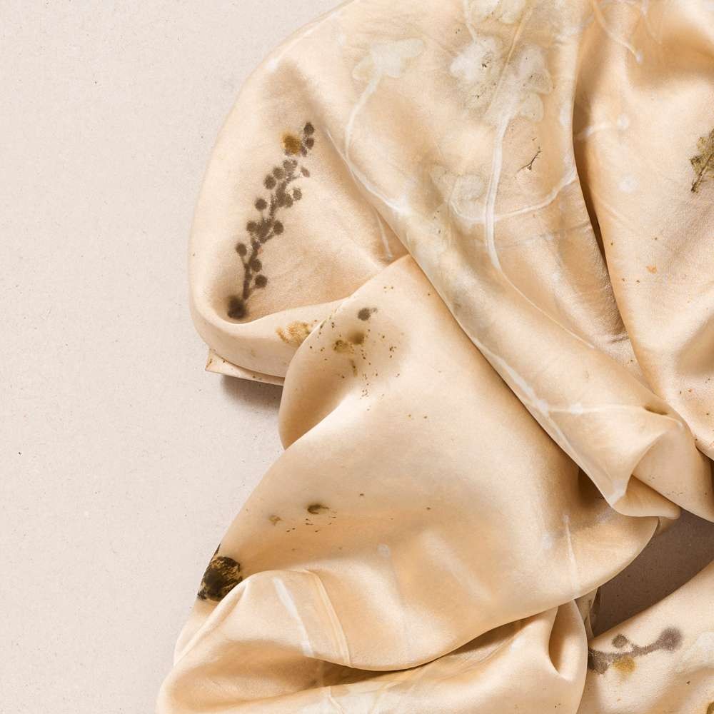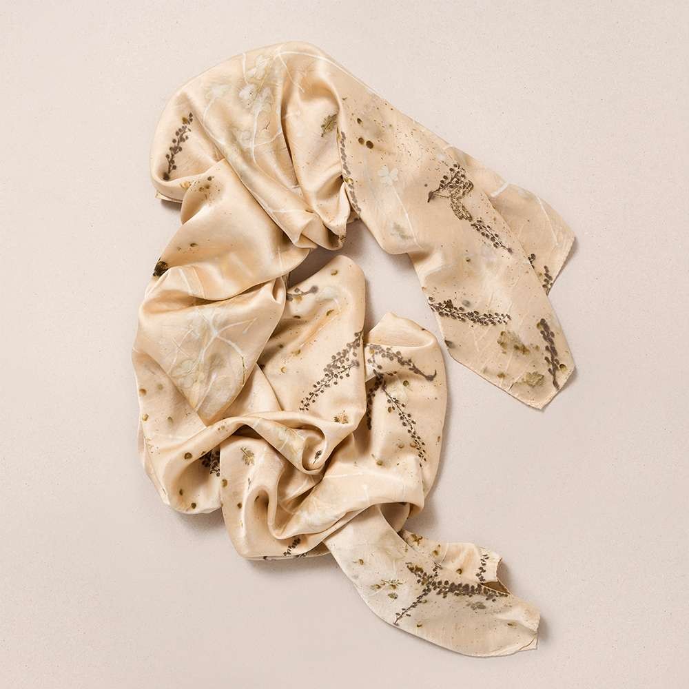 Created with a special eco-printing technique, where delicate white imprints of flowers appear vertically in the center and images of tree tops. Whether worn loosly over the shoulders, tied at the neck or wrapped as a headpiece, it adapts to the moment. Drape it. Wrap it. Knot it. Each 100% silk piece comes with a signed certificate of authenticity listing the natural dyes, techniques and materials used in its making. Uncover what’s within yours.