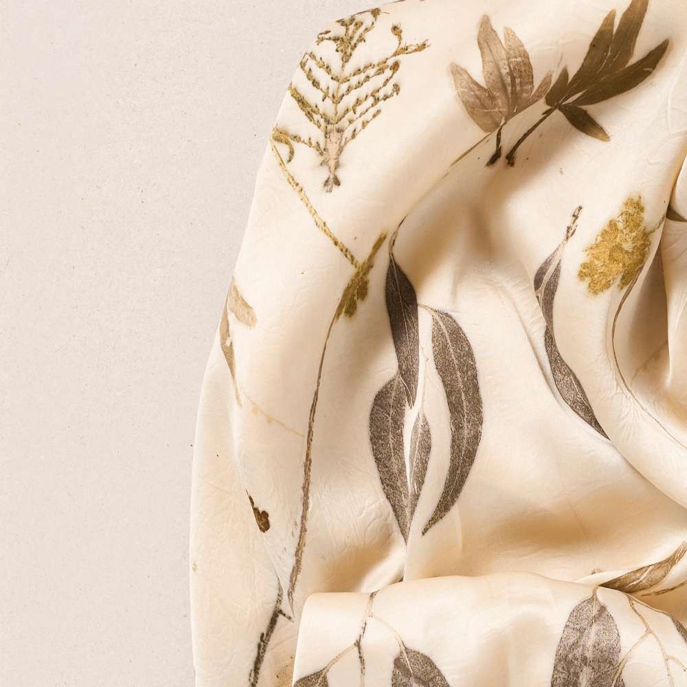 Beige tones form the background, decorated with eco-printed leaves all gathered from Peloponnese, Greece. Whether worn loosly over the shoulders, tied at the neck or wrapped as a headpiece, it adapts to the moment. Drape it. Wrap it. Knot it. Each 100% silk piece comes with a signed certificate of authenticity listing the natural dyes, techniques and materials used in its making. Uncover what’s within yours.