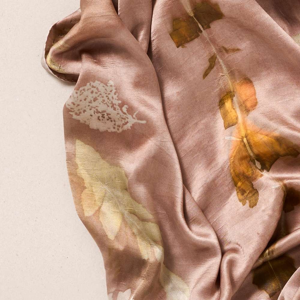 Eco-printed with various kinds of leaves on a soft terracota background. Whether worn loosly over the shoulders, tied at the neck or wrapped as a headpiece, it adapts to the moment. Drape it. Wrap it. Knot it. Each 100% silk piece comes with a signed certificate of authenticity listing the natural dyes, techniques and materials used in its making. Uncover what’s within yours.
