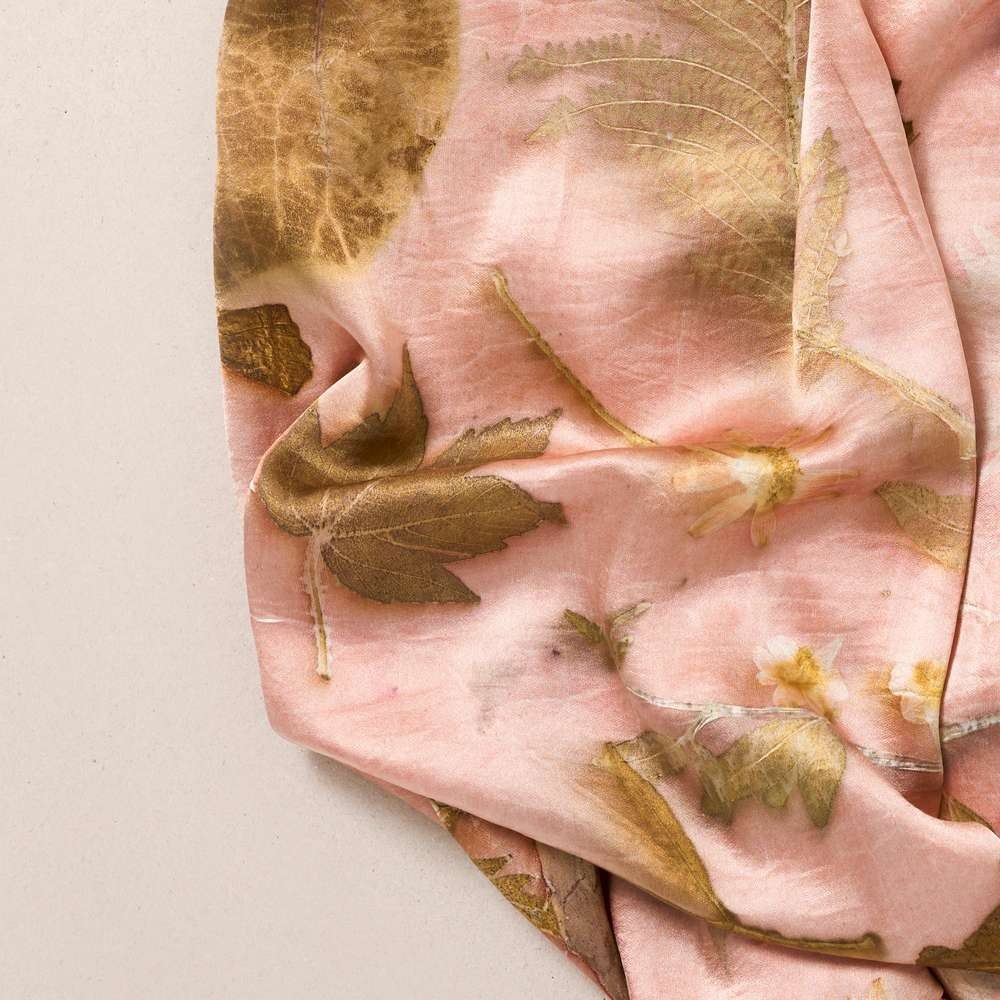 Dyed in a gentle blush pink background and eco-printed with 22 different kinds of leaves and flowers. Whether worn loosly over the shoulders, tied at the neck or wrapped as a headpiece, it adapts to the moment. Drape it. Wrap it. Knot it. Each 100% silk piece comes with a signed certificate of authenticity listing the natural dyes, techniques and materials used in its making. Uncover what’s within yours.