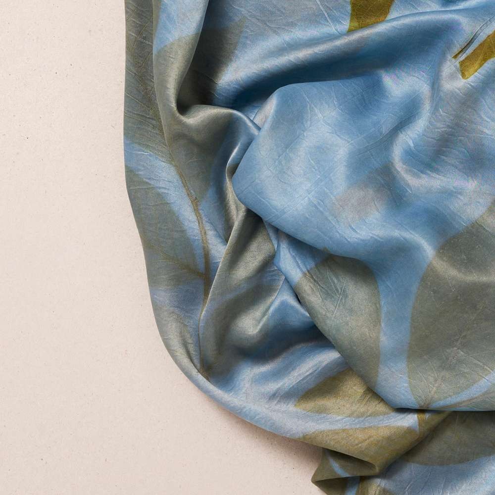 Naturally dyed in clear blue with eco-printed leaves of a single variety. Whether worn loosly over the shoulders, tied at the neck or wrapped as a headpiece, it adapts to the moment. Drape it. Wrap it. Knot it. Each 100% silk piece comes with a signed certificate of authenticity listing the natural dyes, techniques and materials used in its making. Uncover what’s within yours.