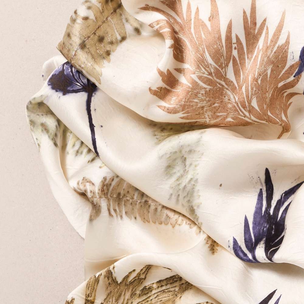 Off-white background, blue, red and golden eco-printed leaf imprints bring in mind the exotic beauty of macaw feathers. Whether worn loosly over the shoulders, tied at the neck or wrapped as a headpiece, it adapts to the moment. Drape it. Wrap it. Knot it. Each 100% silk piece comes with a signed certificate of authenticity listing the natural dyes, techniques and materials used in its making. Uncover what’s within yours.