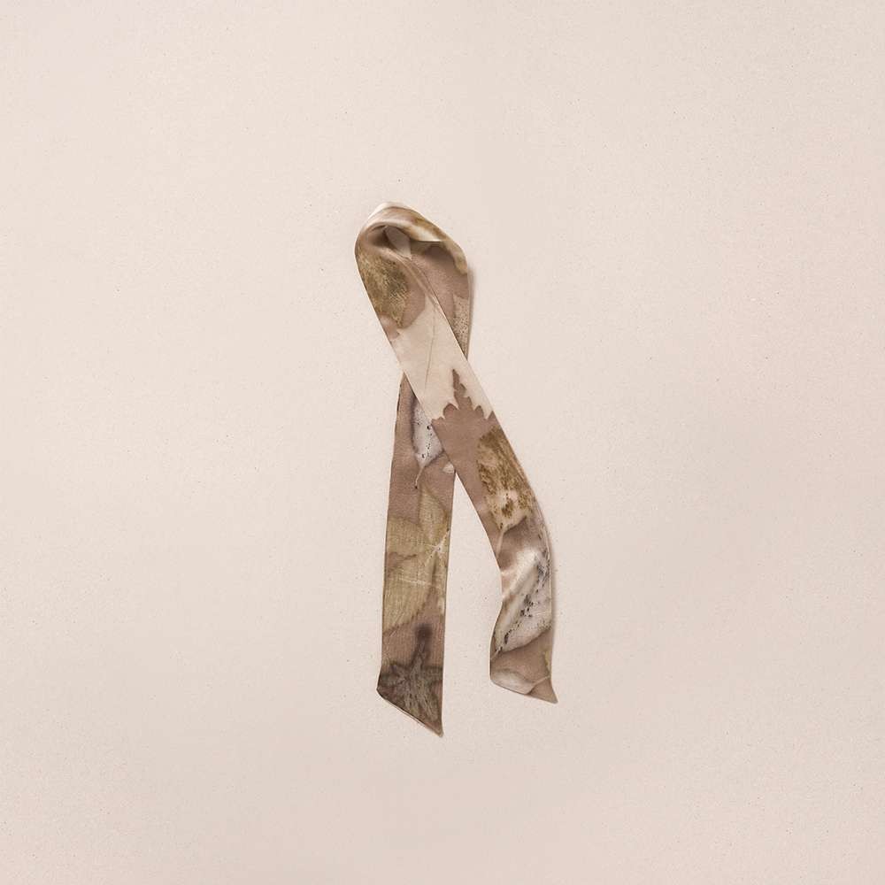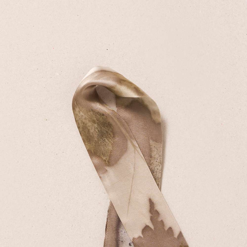Eco-printing of various leaves on a golden-brown muted background. Consider it your most adaptable silk accessory. Add a twist to your outfit -neck, hair, headband, wrist or arm, bag strap- endlessly wearable and open to your own interpretation. The "Silkline" series celebrates the essence of Greece, honoring its folk traditions, festivals, arts and cultural heritage that shape the soul of the country. Each 100% silk piece comes with a signed certificate of authenticity listing the natural dyes, techniques and materials used in its making. Uncover what’s within yours.