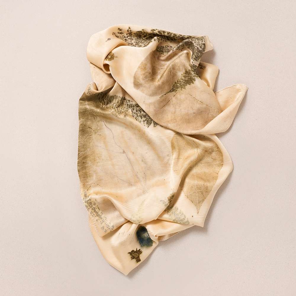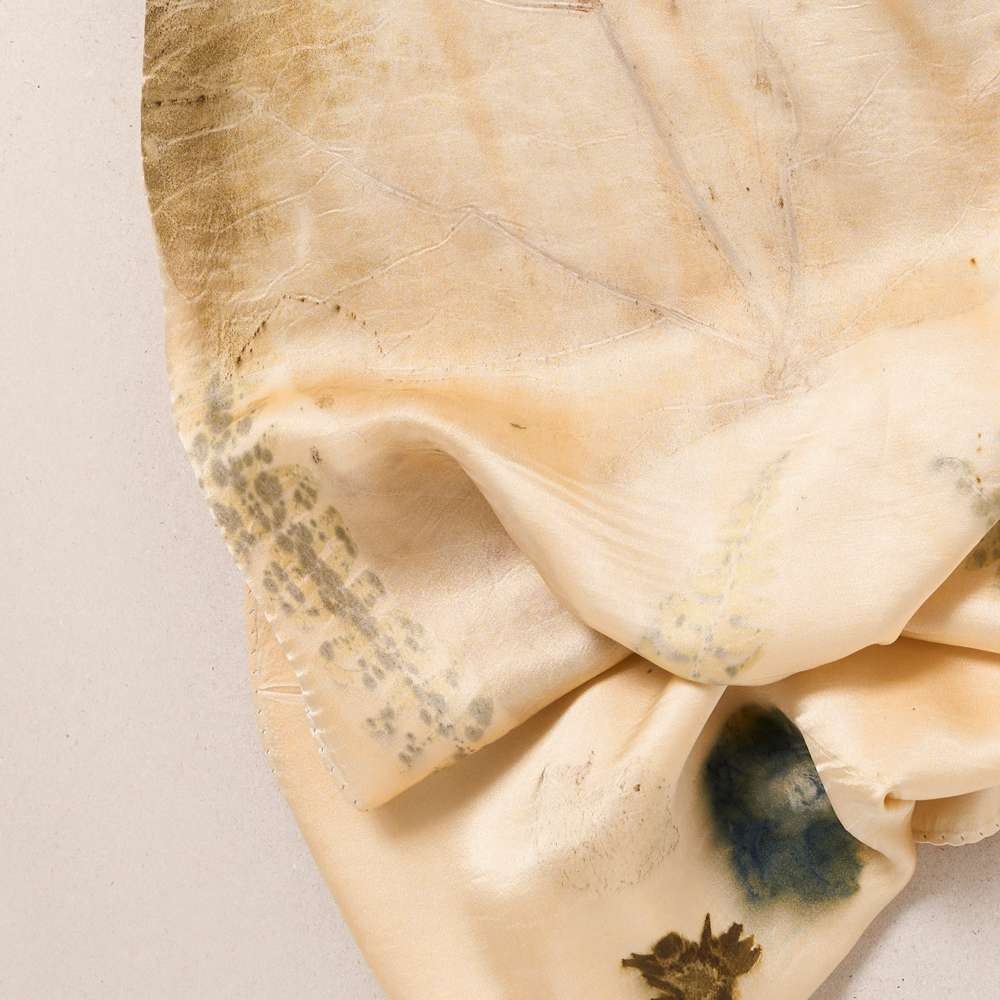 Eco-printed with flowers and rare oversized heart-shaped leaves, some reaching up to 40 cm, carefully collected by Peloponnese, Greece. Set against a soft beige background. It's design is abstract and minimal and it's the only scarf in the current series showing these huge leaves. Whether worn loosly over the shoulders, tied at the neck or wrapped as a headpiece, it adapts to the moment. Drape it. Wrap it. Knot it. Each 100% silk piece comes with a signed certificate of authenticity listing the natural dyes, techniques and materials used in its making. Uncover this giant leaf.