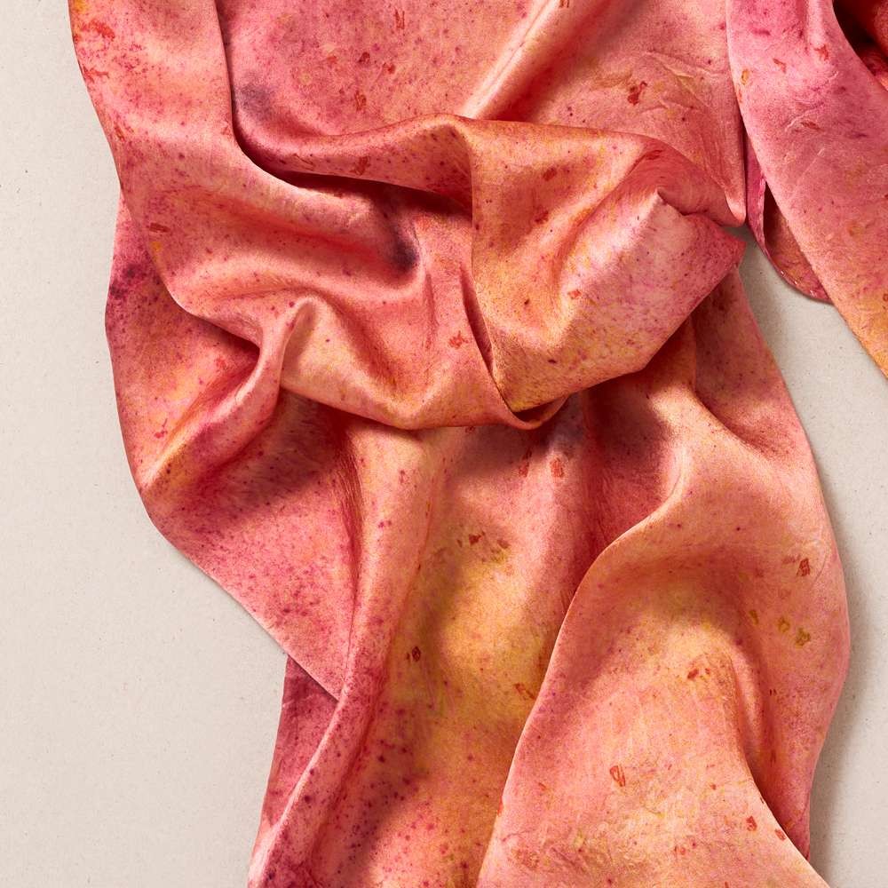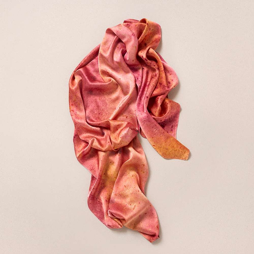 Dyed with natural ingredients, it glows in soft pink and yellow shades. Whether worn loosly over the shoulders, tied at the neck or wrapped as a headpiece, it adapts to the moment. Drape it. Wrap it. Knot it. Each 100% silk piece comes with a signed certificate of authenticity listing the natural dyes, techniques and materials used in its making. Uncover what’s within yours.