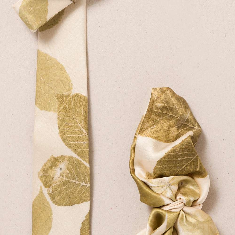 Silk pieces naturally imprinted with greenish leaves using eco-printing technique. Perfect for wedding moments. Style it in a classic knot, or don't. NFOLD's way? Tie isn't bound by gender. Tie it loose. Let it hang. And tuck the matching square in your pocket, wrap it around your wrist, your hair, your bag. Just one condition: forget the rules, wear it your way. With confidence. Our artisan in Greece has been handcrafting ties since 1964. Each piece comes with a signed certificate of authenticity listing the natural dyes, techniques and materials used in its making. Uncover what’s within yours.