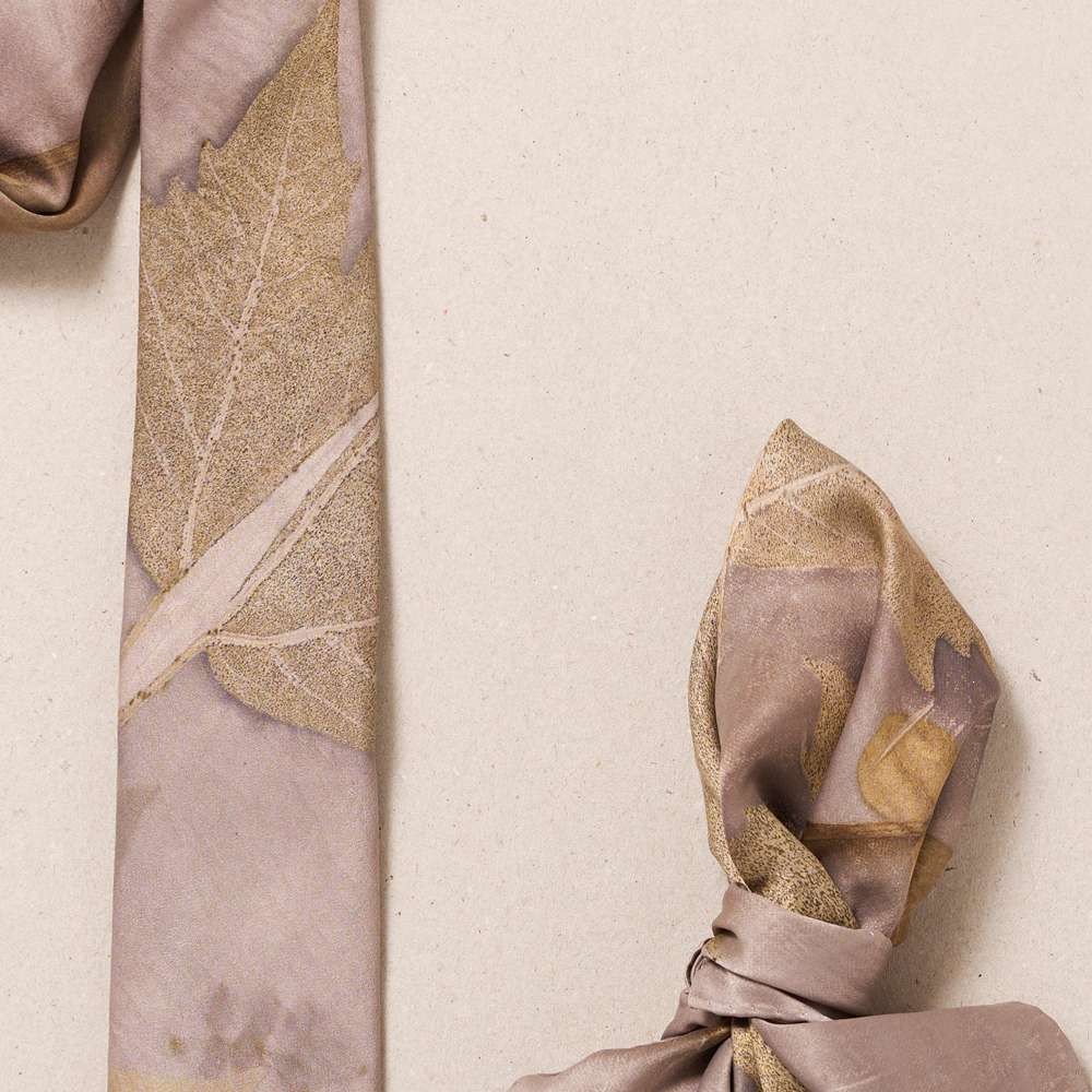 Botanical-printing technique applied, where real leaves leave behind their imprints on purple-grey silk shade. Style it in a classic knot, or don't. NFOLD's way? Tie isn't bound by gender. Tie it loose. Let it hang. And tuck the matching square in your pocket, wrap it around your wrist, your hair, your bag. Just one condition: forget the rules, wear it your way. With confidence. Our artisan in Greece has been handcrafting ties since 1964. Each silk piece comes with a signed certificate of authenticity listing the natural dyes, techniques and materials used in its making. Uncover what’s within yours.